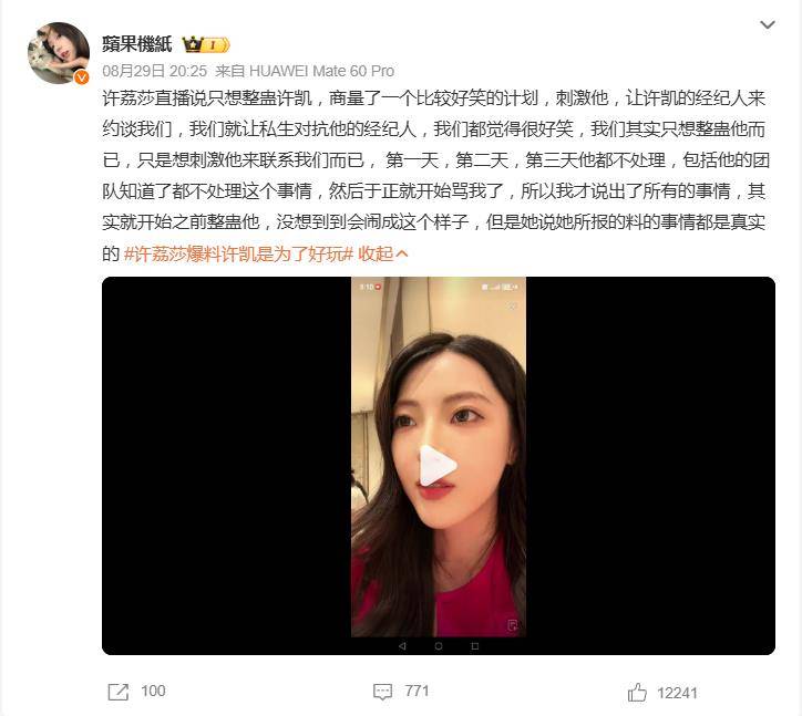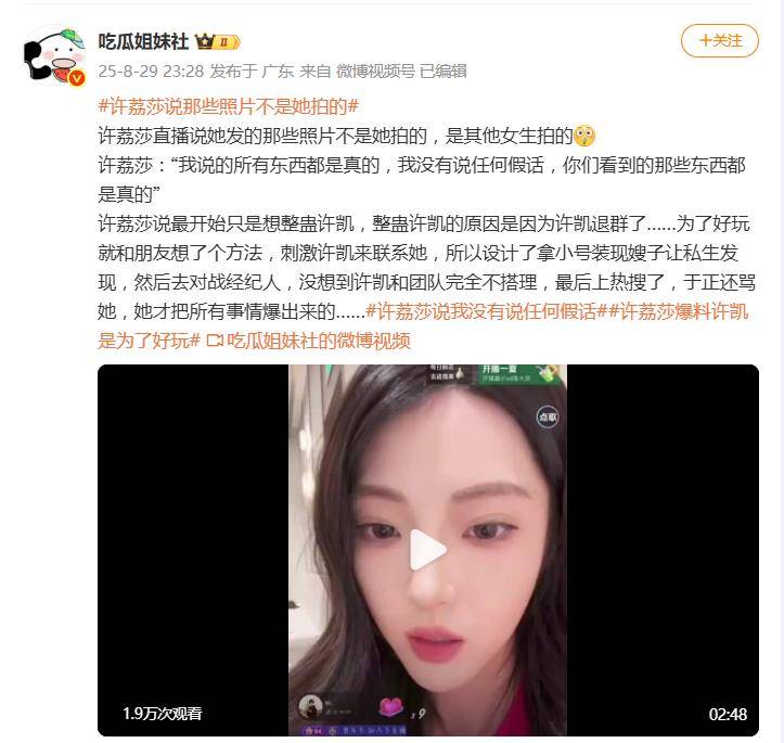 整件事的起源听起来甚至有些儿戏。据许荔莎称,她与许凯及几位共同好友原本同在一个微信群,但许凯突然退群。她一怒之下发出“退群就微博见”的警告,却未得到任何回应。于是,她和一名女性朋友策划了一场“整蛊计划”:用一个仅有200粉丝的小号,发布虚构的“秀恩爱”聊天记录和照片,目的是激怒许凯的私生粉,从而迫使经纪人主动联系她们谈判。许荔莎在直播中坦言:“我们都觉得很好笑,只是想刺激他来联系我们而已。”