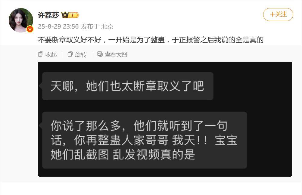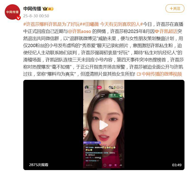 整场闹剧从“为了好玩”开始,最终演变成一场涉及法律边界的公关大战,有网友认为,许荔莎称爆料许凯是为了好玩,爆料是假的。8月29日深夜,许荔莎在微博解释:“不要断章取义好不好,一开始是为了整蛊,于正报警之后我说的全是真的”。