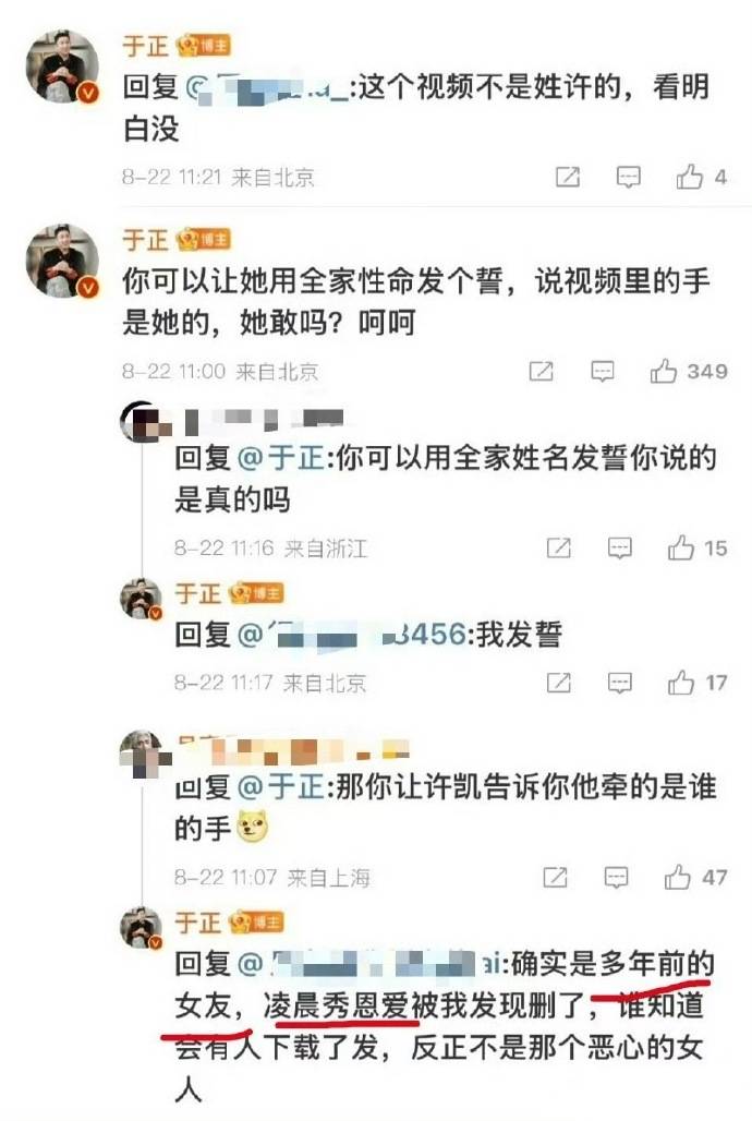 这场风波中,双方各执一词。于正此前已强烈质疑照片真实性,甚至要求许荔莎“用全家性命发誓”照片中的手是她的,并称这些是“许凯多年前女友拍摄的旧照”,被他人恶意下载传播。