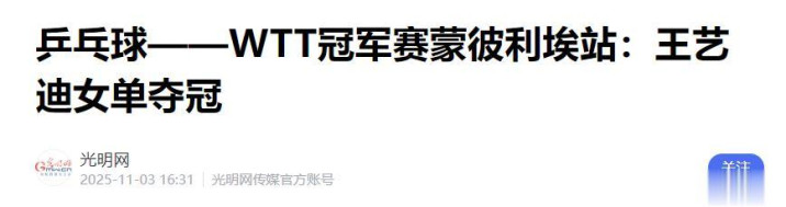 光明网——乒乓球——WTT冠军赛蒙彼利埃站:王艺迪女单夺冠