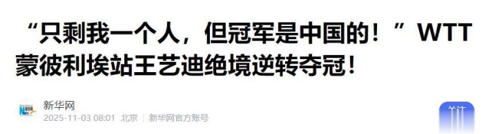 新华社——“只剩我一个人,但冠军是中国的!”WTT蒙彼利埃站王艺迪绝境逆转夺冠!